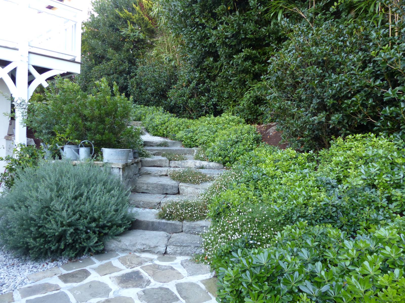 Aménagement paysager complet : Nous réalisons l'ensemble des travaux, incluant la plantation de végétaux, la création de massifs, l'installation de pelouses, la construction de murs de soutènement en bois exotique, d'allées et de terrasses.